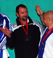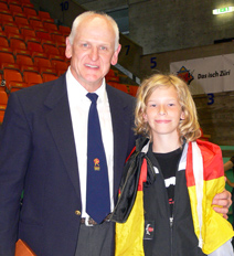 Jonas Schumann mit Shihan C. Thomson (8.Dan) Für Jonas war diese WM der erste internationale Auftritt. Er freut sich schon auf die EM 2009 in Deutschland !!! |